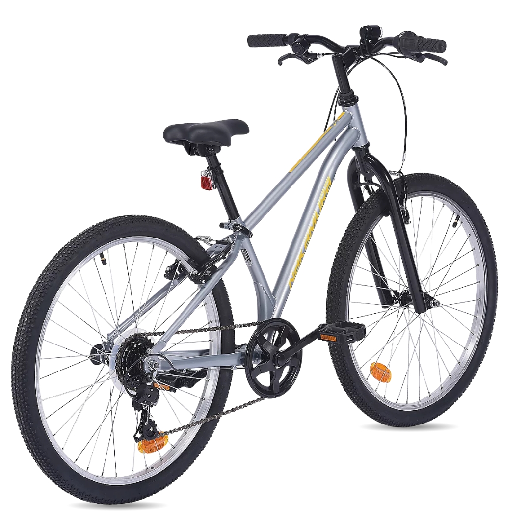 Pour offrir une conduite fluide et agréable, ce VTT est équipé de roues de 24 pouces et de pneus crantés capables d’absorber les irrégularités du terrain. En complément, un éclairage LED amovible permet de rester visible lors des balades en fin de journée. Ses pédales larges antidérapantes garantissent quant à elles une excellente stabilité, même sur sol humide.